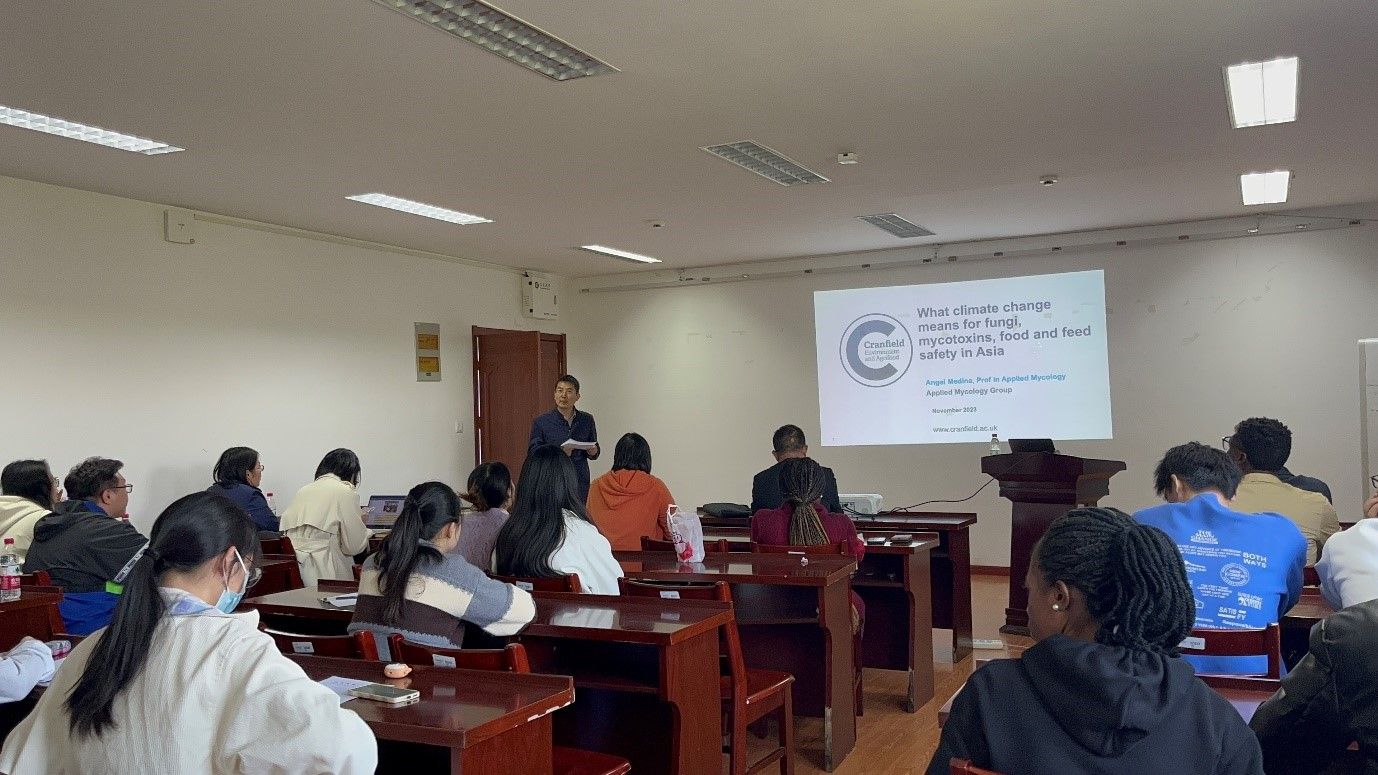 On November 7, 2023, Professor Angel Medina Vaya from the Applied Mycology Group at Cranfield University (UK) visited FBE and gave an enlightening lecture on the topic “What climate change means on fungi, mycotoxins, food and feed safety in Asia”. Prof. Cunshan Zhou, the vice dean of FBE, hosted the lecture at meeting room 506 in Wenhua building. This meeting was open to young teachers and overseas students.