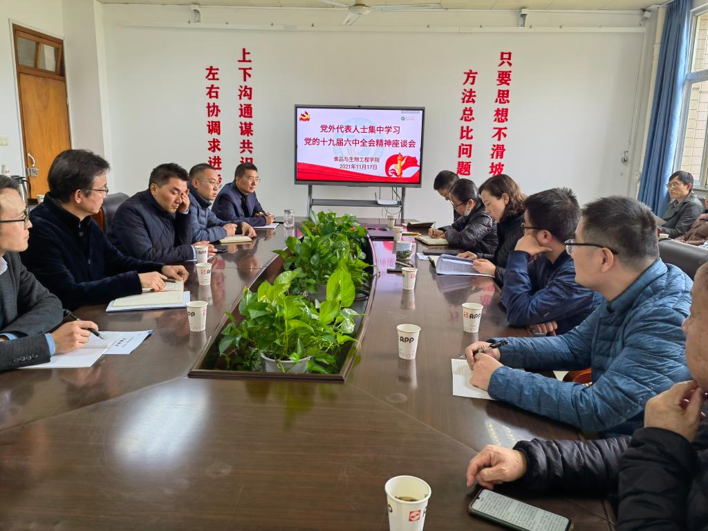 11月17日,bat365中文官方网站党外代表人士集中学习党的十九届六中全会精神座谈会在食品楼302会议室召开,来自全院各民主党派和党外人士代表20余人集中学习全会精神,进一步凝聚共识、坚定自信,为助力学院事业高质量发展团结奋斗。座谈会由学院党委书记万由令主持。