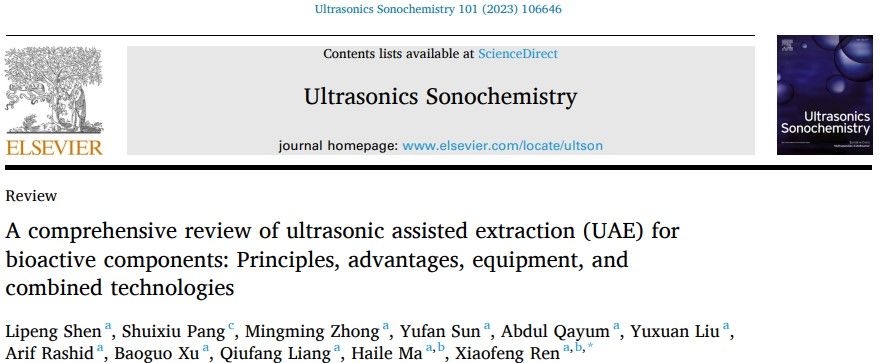 近日,bat365中文官方网站任晓锋教授课题组在国际声学顶级期刊《Ultrasonics Sonochemistry》(Q1,IF=8.4)在线发表了标题为 “A comprehensive review of ultrasonic assisted extraction (UAE) for bioactive components: Principles, advantages, equipment, and combined technologies”的综述性论文 (DOI: 10.1016/j.ultsonch.2023.106646)。bat365中文官方网站硕士生申利鹏为该论文的第一作者,任晓锋教授为通讯作者。