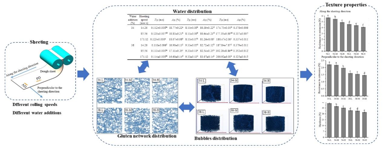 压延是面条加工过程中的关键步骤,和面后的面絮只有在轧辊的碾压作用下,疏松散乱的面筋才能形成连续的网络结构,松散的面絮才能形成具有一定韧性和强度的面带。论文通过面带中的水分分布、面筋网络的形成以及气泡分布研究了加水量(34%和38%)不同时,压延速度对面带加工品质的影响。由于水的软化作用,加水量为38%的面带比加水量为34%的面带具有较低的硬度和拉伸强度,尽管其面筋蛋白交联度较高,面筋网络结构更加致密,面带中的气泡更少。此外,提高压延速度使水分子的流动性增加,面筋交联度降低,面筋网络分布松散,面带内部结构不均匀,气泡较多,从而导致面带硬度和拉伸强度下降;并且,加水量较高时,面筋蛋白的高度水合削弱了压延速度对面带加工品质的影响。研究结果为面条加工过程中压延速度的精准调控提供了理论支撑。本研究得到了国家自然基金(31601399)的支持。