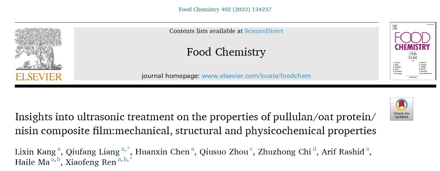近日,bat365中文官方网站任晓锋教授在Food Chemistry (Q1)期刊上发表了题为“Insights into ultrasonic treatment on the properties of pullulan/oat protein/nisin composite film:mechanical, structural and physicochemical properties”的研究论文。2020级硕士研究生亢利鑫为论文第一作者,任晓锋教授和梁秋芳博士为论文共同通讯作者。