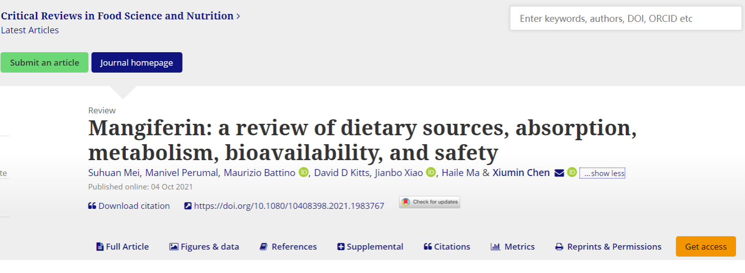 bat365中文官方网站陈秀敏教授在国际食品领域顶级期刊Critical Reviews in Food Science and Nutrition在线发表题为“Mangiferin: a review of dietary sources, absorption, metabolism, bioavailability, and safety”的综述(https://doi.org/10.1080/10408398.2021.1983767),介绍了近年来芒果苷在吸收代谢方面的研究进展以及提高芒果苷溶解度和生物利用度的最新方法,讨论了影响芒果苷在食品中含量的因素以及利用纳米技术和联合用药等提高芒果苷生物利用度等新型生物专利技术。该成果已被《食品加 智食科技》公众号(https://mp.weixin.qq.com/s/nS363_2xdfajF5kKH9GAdA)推送,产生了较大的学术影响。本文的第一作者为bat365中文官方网站2019级博士生梅素欢,bat365中文官方网站陈秀敏教授为本文的唯一通讯作者,博士后Manivel Perumal,Maurizio Battino教授,David D Kitts教授,肖建波教授和马海乐教授为共同作者。