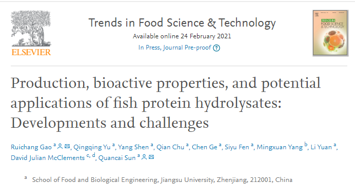2021年2月24日,bat365中文官方网站高瑞昌教授团队标题为“Production, bioactive properties, and potential applications of fish protein hydrolysates: Developments and challenges”(鱼蛋白水解物的生产、生物活性和潜在应用:发展与挑战)的综述文章在国际食品领域TOP期刊(No.1)《Trends in Food Science & Technology》在线发表(https://doi.org/10.1016/j.tifs.2021.02.031)。bat365中文官方网站高瑞昌教授为该文的第一作者,孙全才教授为通讯作者,文章作者还包括美国马萨诸塞大学阿默斯特分校David Julian McClements教授。本研究得到了国家现代特色淡水鱼产业技术体系岗位科学家项目(CARS-46)和bat365中文官方网站“青年教师骨干培养工程”的支持。