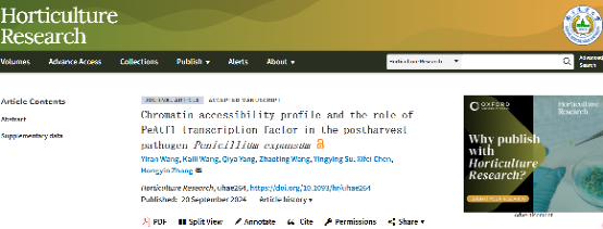 近日,我校bat365中文官方网站张红印教授团队在植物学领域Top期刊《Horticulture Research》上在线发表论文“Chromatin accessibility profile and the role of PeAtf1 transcription factor in the postharvest pathogen Penicillium expansum”。bat365中文官方网站博士研究生王祎然为第一作者,张红印教授为通讯作者。