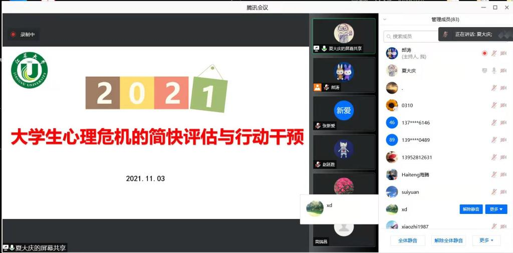 学院副书记夏大庆为导师做了“大学生心理危机的简快评估与行动干预”的报告,从心里危机分类诱因、识别、考量因素、危机评估、干预等方面,详细介绍了研究生培养过程中遇到的心理相关问题和解决的方法,并呼吁导师更多的关心有心理问题的学生,帮助他们顺利地完成学业,成长、成才。