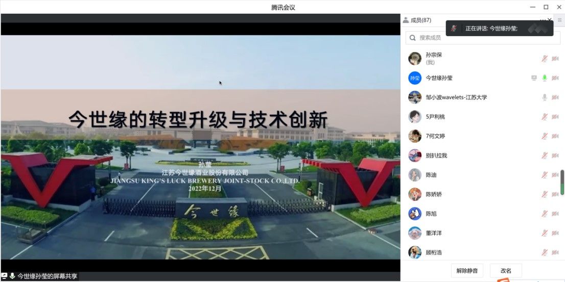 近日,由bat365中文官方网站的“产业教授进校园活动”顺利举行,本次会议邀请了江苏省产业教授、江苏今世缘酒业股份有限公司勾储中心孙莹主任在线上为同学们做了“今世缘的转型升级与技术创新”的专题报告。bat365中文官方网站邹小波院长主持会议,bat365中文官方网站100余名师生线上参与学习。