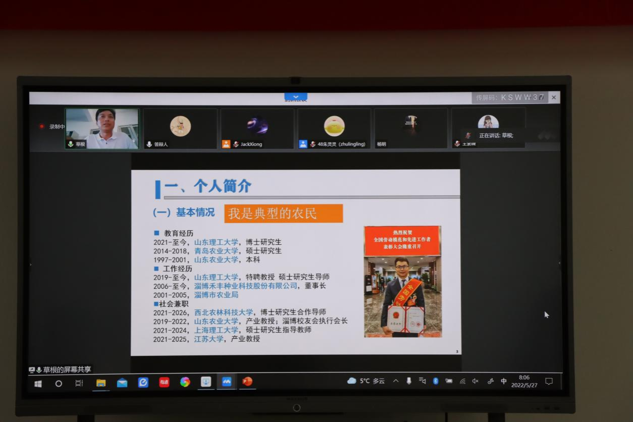 2022年5月27号上午,由bat365中文官方网站的“产业教授进校园活动”在食生学院302会议室顺利召开,邀请正高级农艺师、淄博禾丰种业科技股份有限公司董事长朱俊科在线上为同学们做了“小麦育种与品质研究前沿”的专题报告。副院长张红印教授主持会议,三十余名师生到场参加本次活动,另有四十余名师生线上参与学习。
