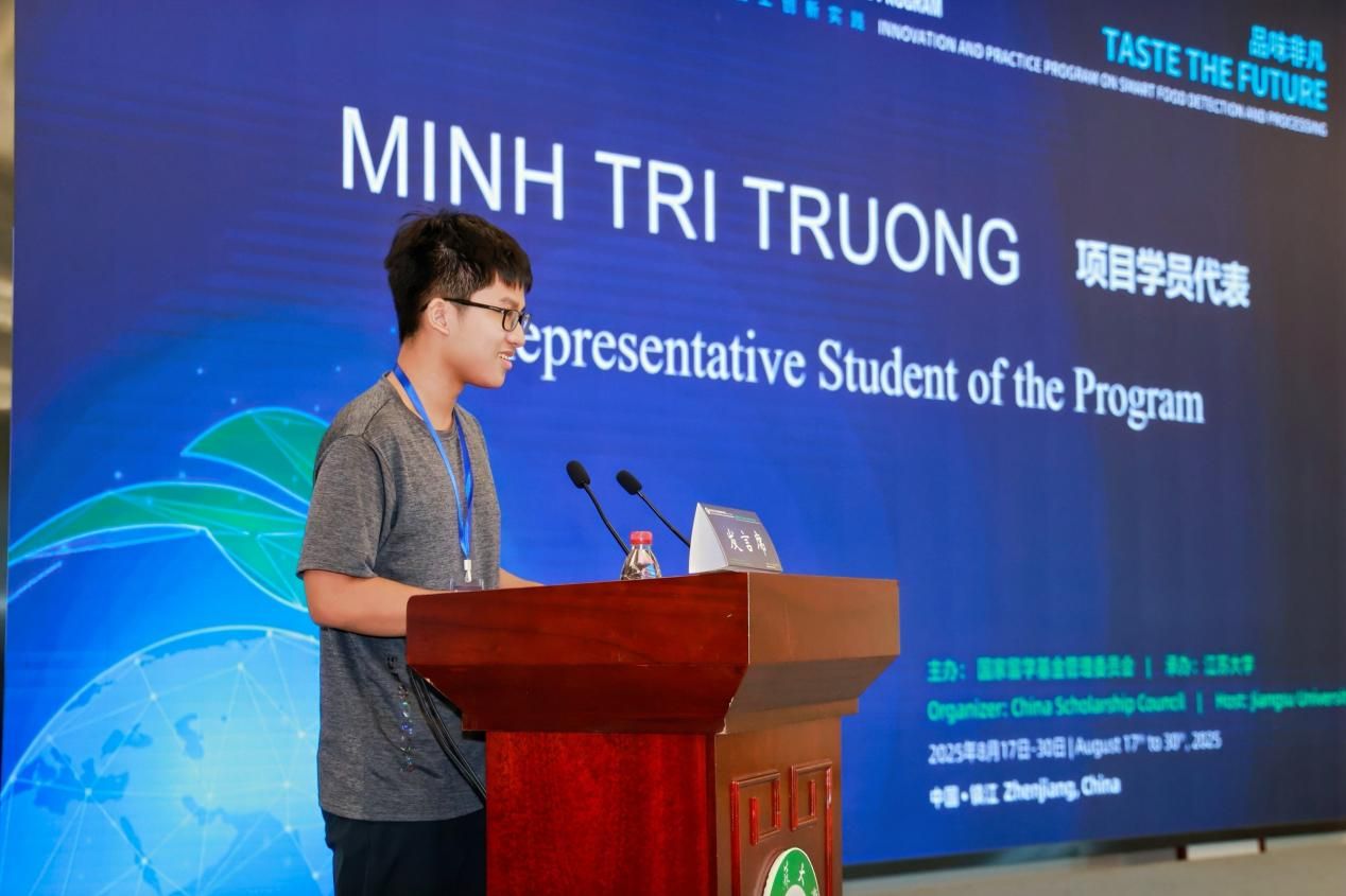 越南学员代表张明智(MINH TRI TRUONG)结合本国谚语“百闻不如一见”,分享了对中国智能食品技术的期待。他呼吁同学们珍惜机会,既做学术探索者,也做文化沟通的桥梁,共同应对全球食品安全的挑战。